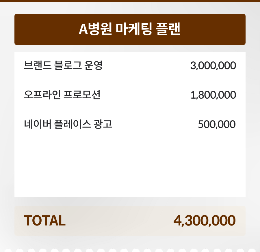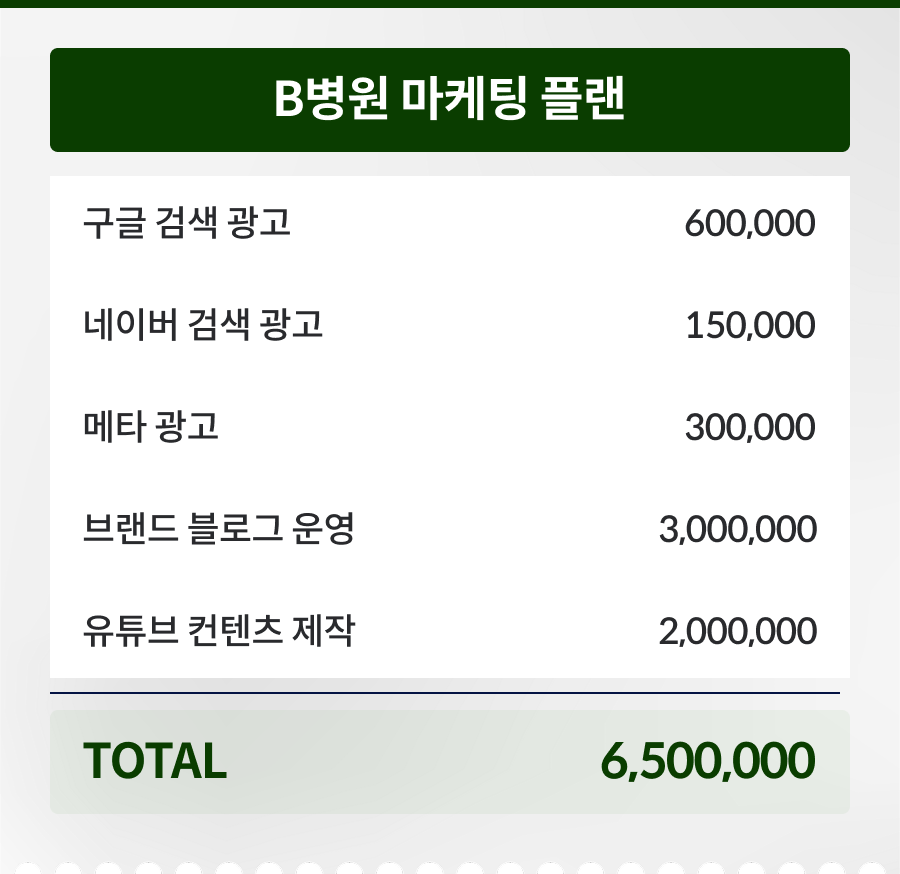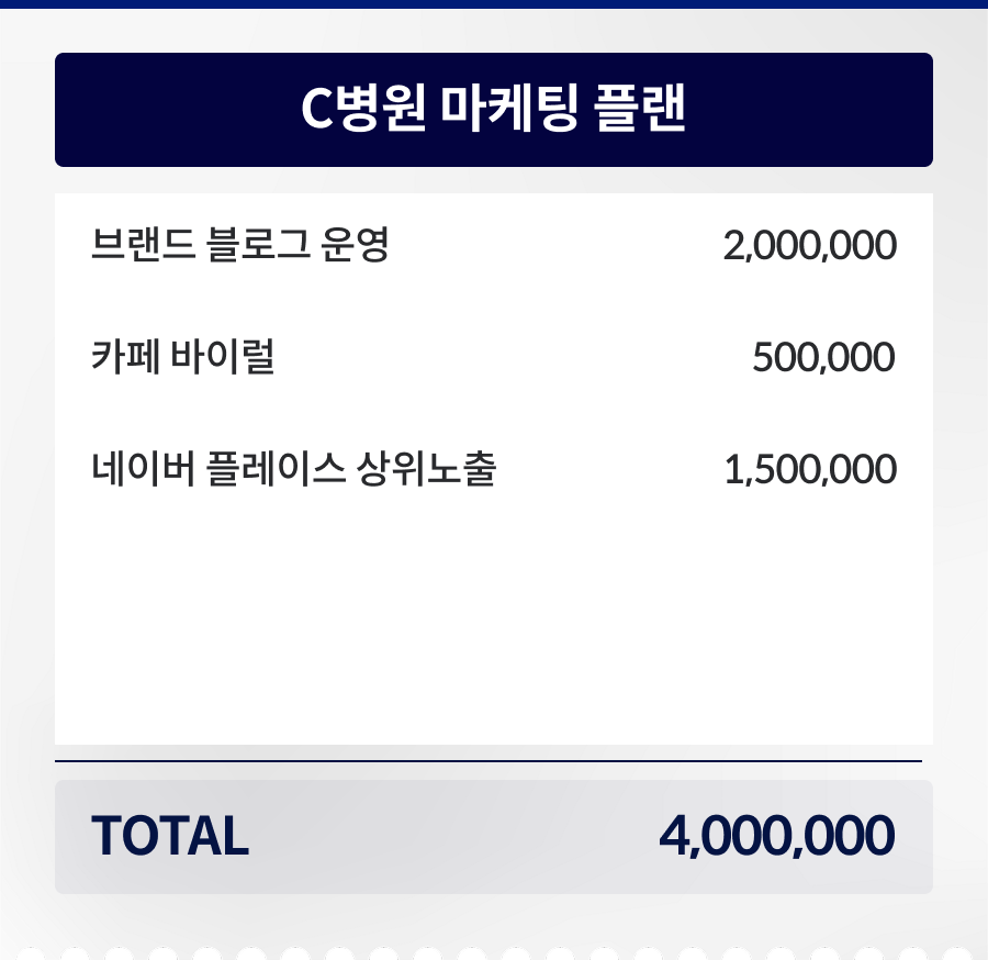 진료과목별, 지역별, 타겟 고객 특성은 물론 원장님의 목표에맞는 차별화된 전략을 위해 시간을 들이고 정성을 들입니다.