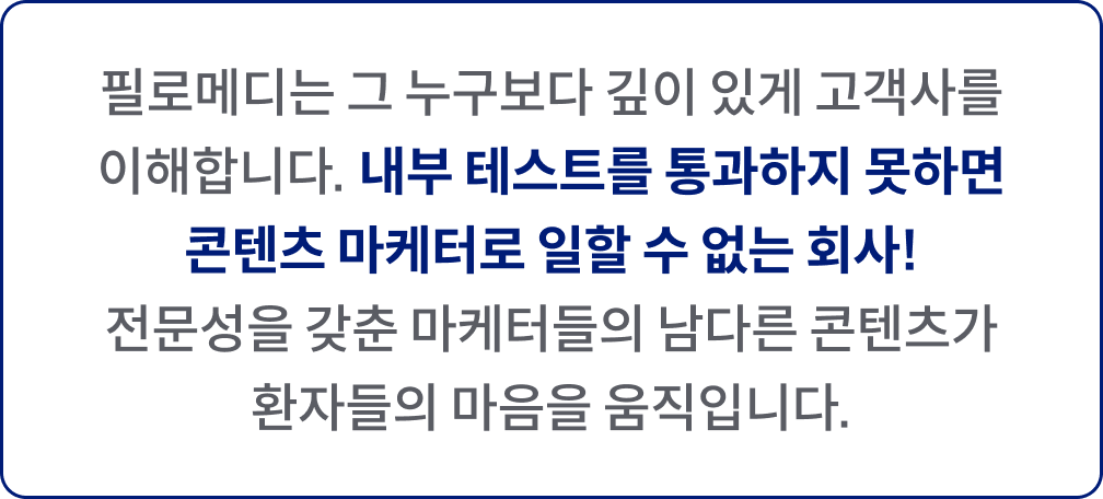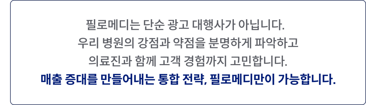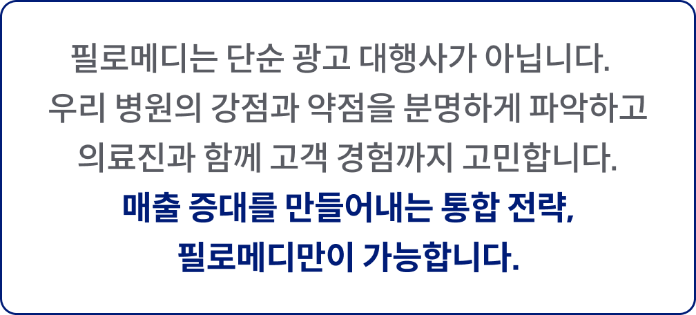 우리 병원의 진짜 숨은 힘을 활용하여환자들에게 다가갈 수 있도록필로메디는 진짜 전략을 만들어 드립니다.